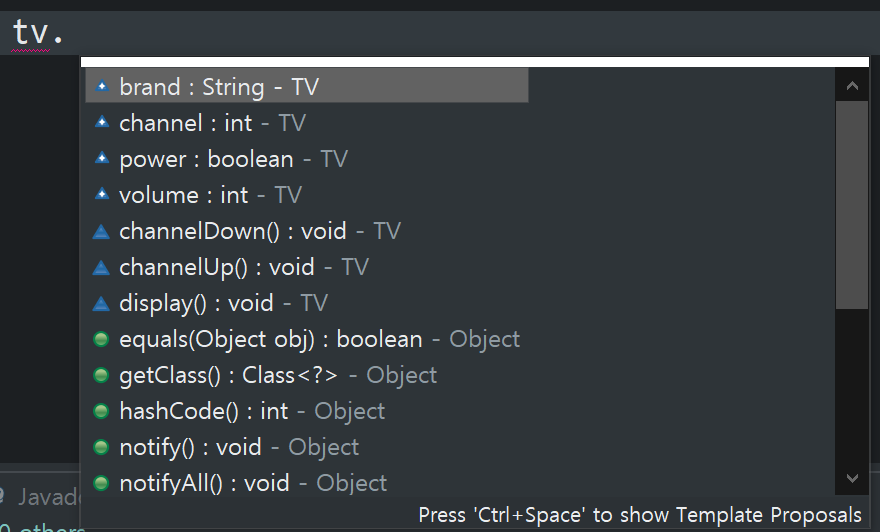 이렇게 생성된 tv는 TV객체를 참조하며 . (도트연산자)로 각 멤버에 접근할수 있다.