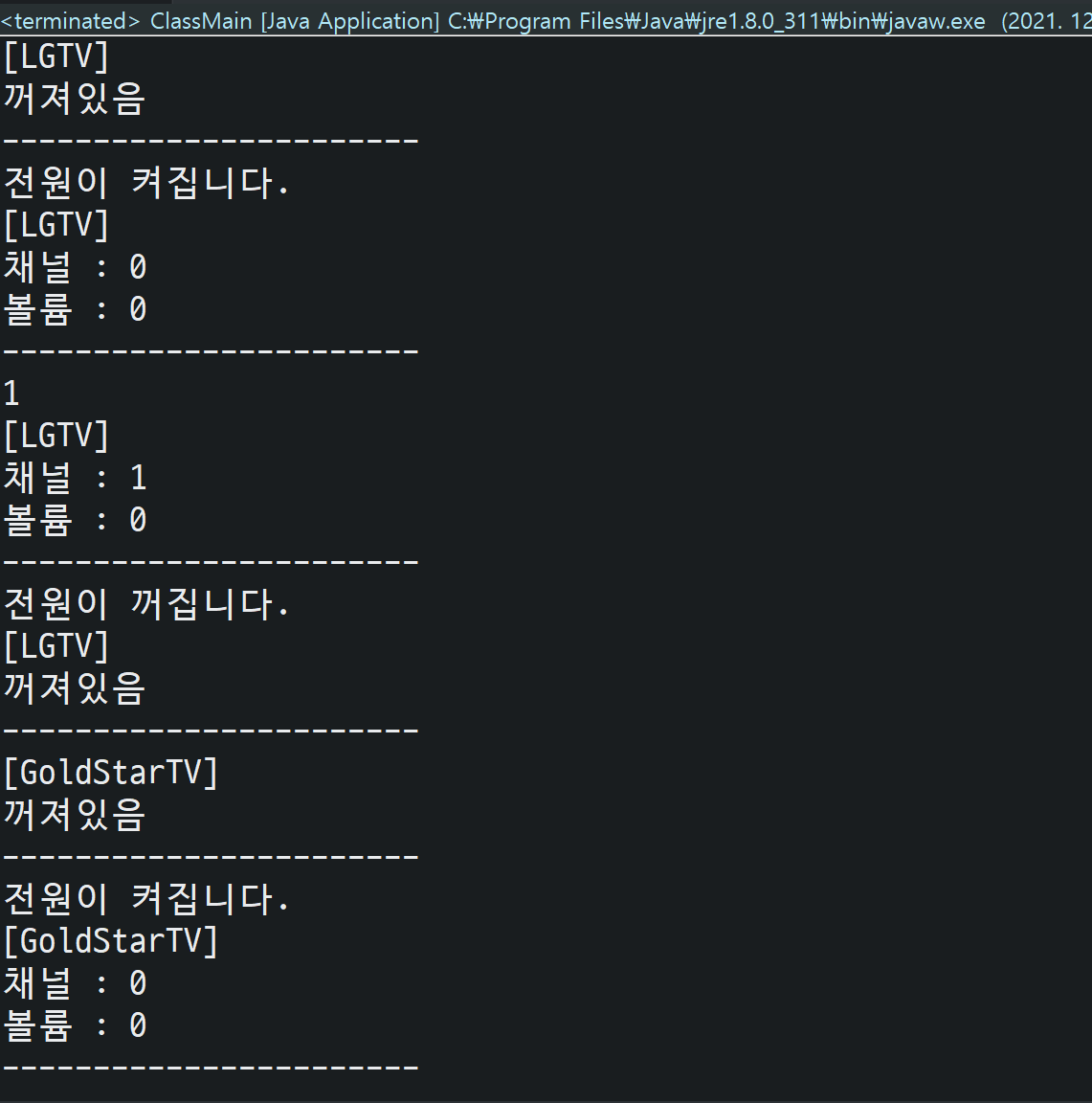 다음 편에는 리모콘이라는 클래스를 이용하여 TV를 작동하는 예제를 만들어 볼 것이다.