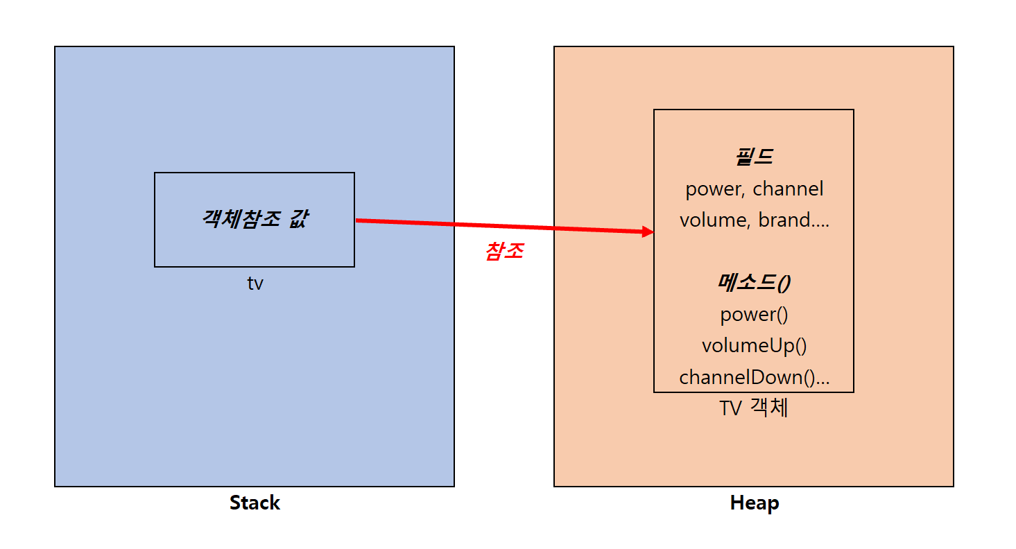 그리고 tv라는 변수는 만들어진 객체의 값을 직접 갖고있는것이 아닌 Heap에 있는 객체를 참조하는 값을 갖고있다.